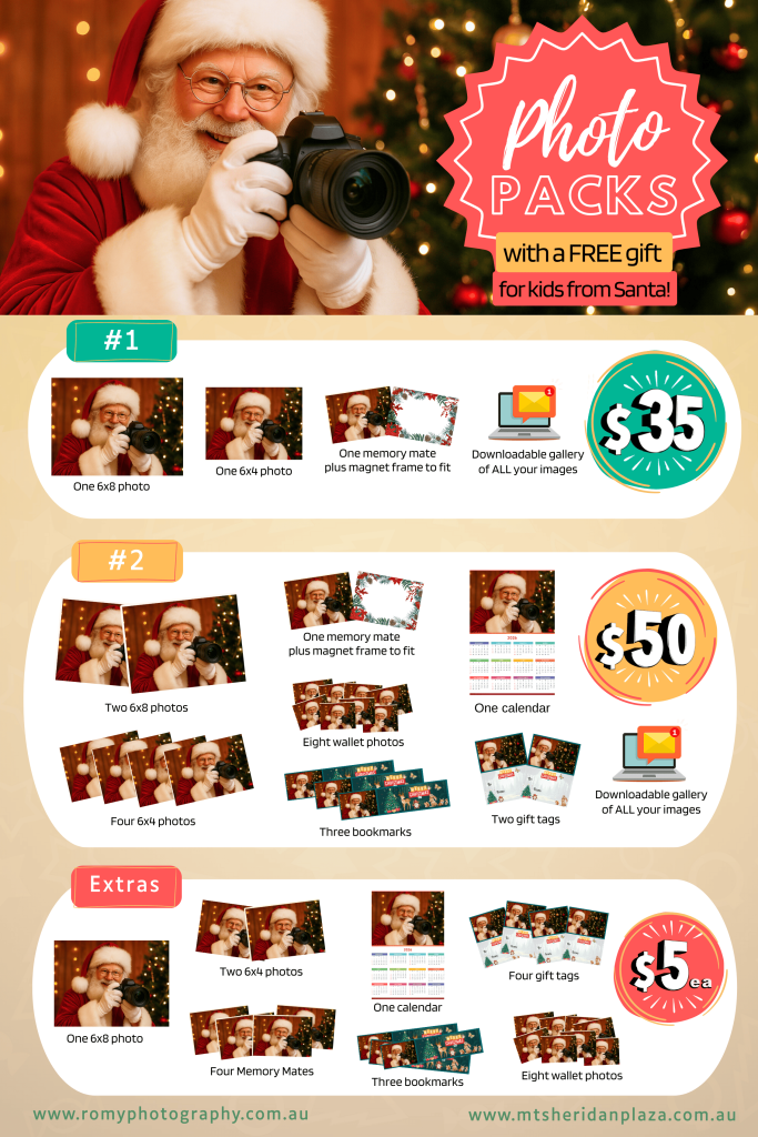 Capture the magic of Christmas in magical Santa’s Garden at Mt Sheridan Plaza! This year, Romy Photography is back with affordable, great-value photo packages starting from just $35! Each package includes a selection of your photo prints, ready straight after your session — and every package includes ALL of your digital images, so you don’t have to choose just one favourite.